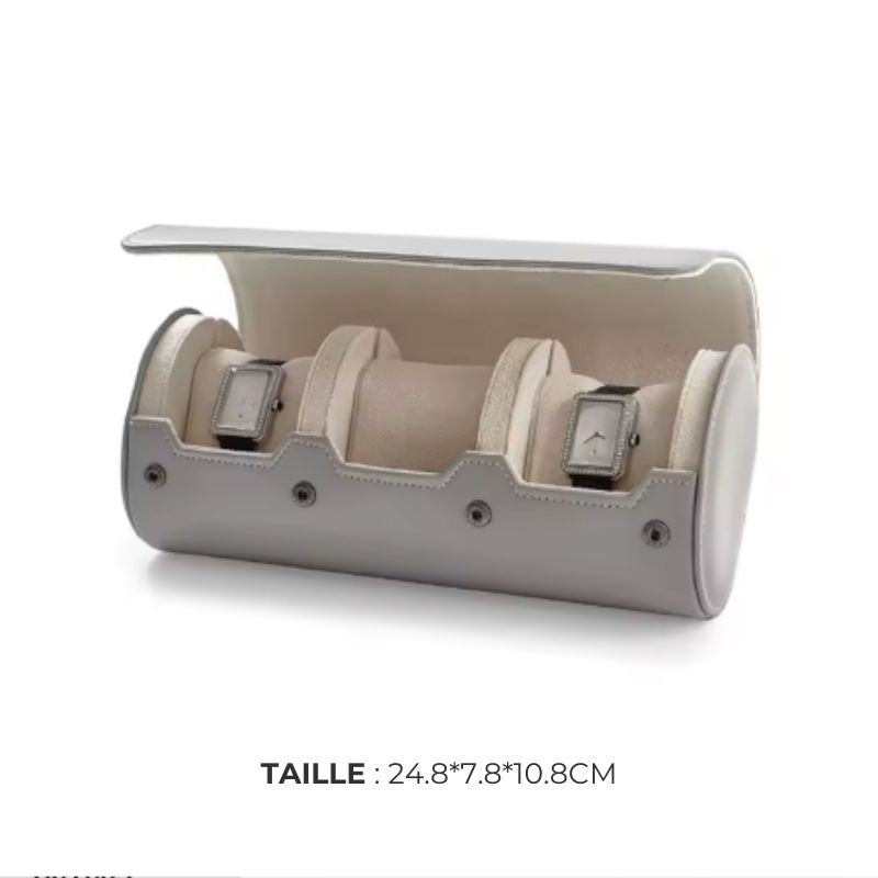 Conçue pour accompagner vos déplacements, cette boite à montre de voyage en cuir combine élégance, légèreté et protection. Son design forme tonneau et son revêtement en cuir premium gris en font un étui raffiné, aussi adapté aux voyages qu’à l’usage quotidien. L’intérieur en doublure douce protège efficacement vos montres des rayures et des chocs, tout en assurant une présentation soignée. Disponible en 1, 2 ou 3 emplacements, elle s’adapte à tous les besoins.