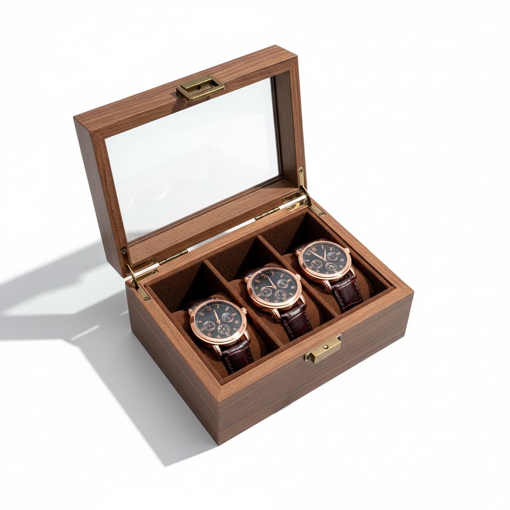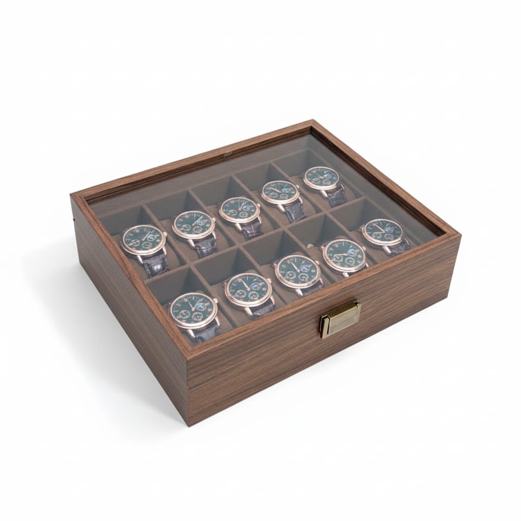 Que Contient Mon Colis : Une boite à montre en bois de noyer, capacité selon la variante choisie, prête à organiser et mettre en valeur votre collection.