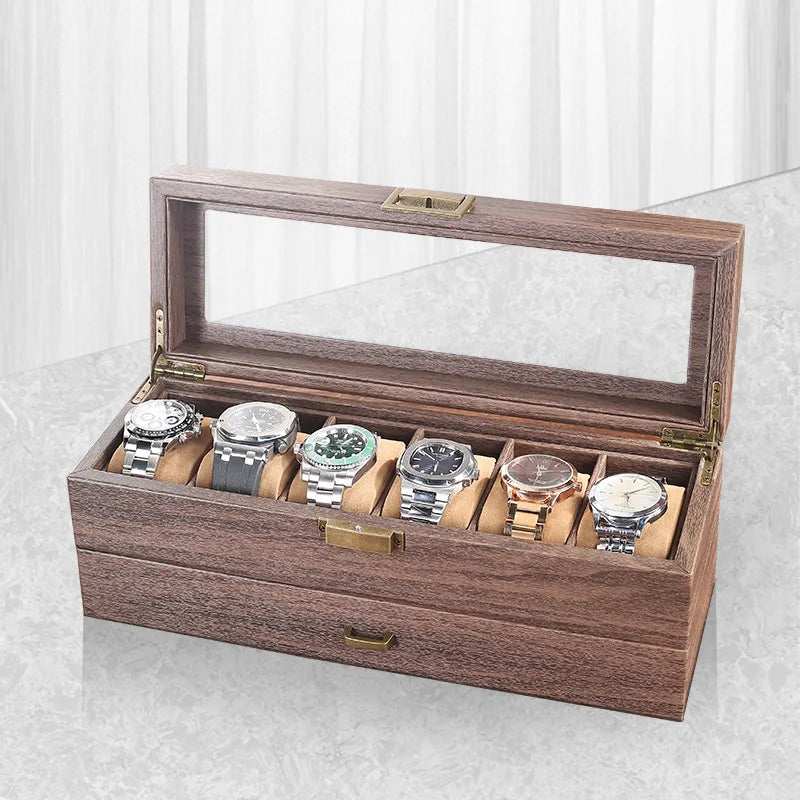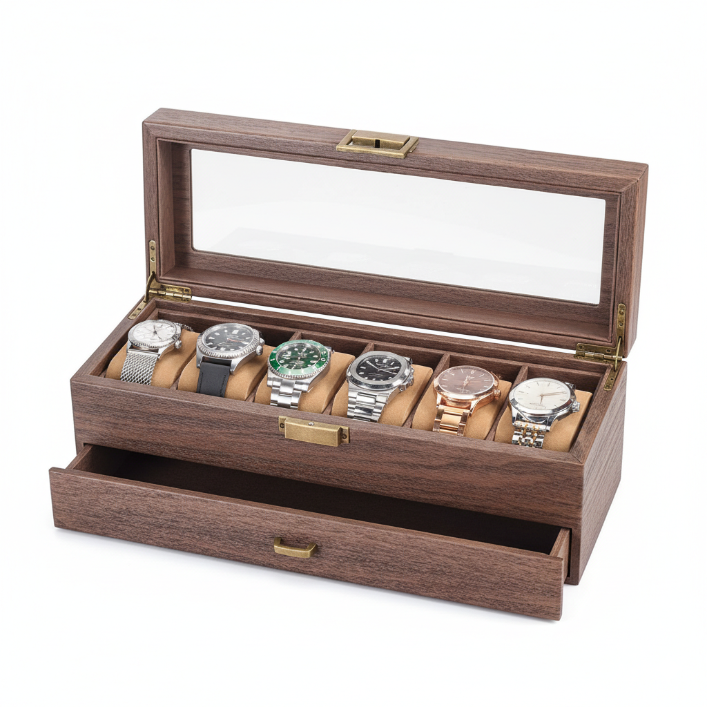 Que Contient Mon Colis : Une boite à montre double couche conçue pour accueillir jusqu’à 6 montres et accessoires, soigneusement emballée pour une protection optimale.