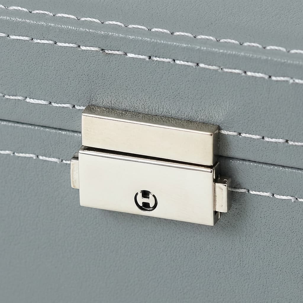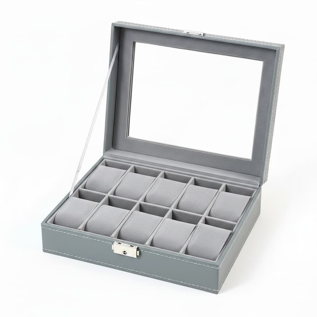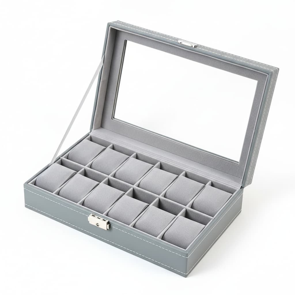 Cette boite à montres en cuir gris est conçue pour offrir un rangement élégant, structuré et sécurisé à votre collection. Son revêtement en cuir synthétique gris apporte une touche sobre et moderne, idéale pour un usage quotidien à la maison comme pour une présentation soignée.