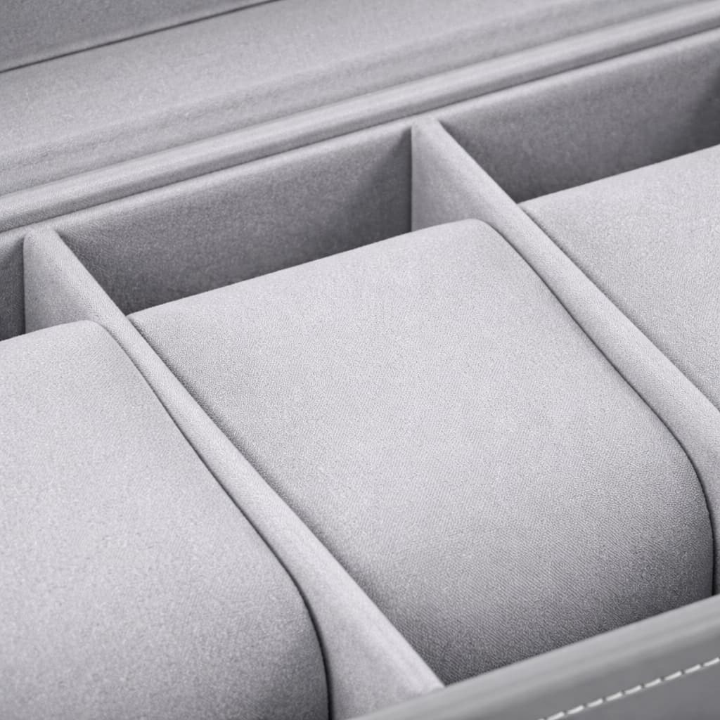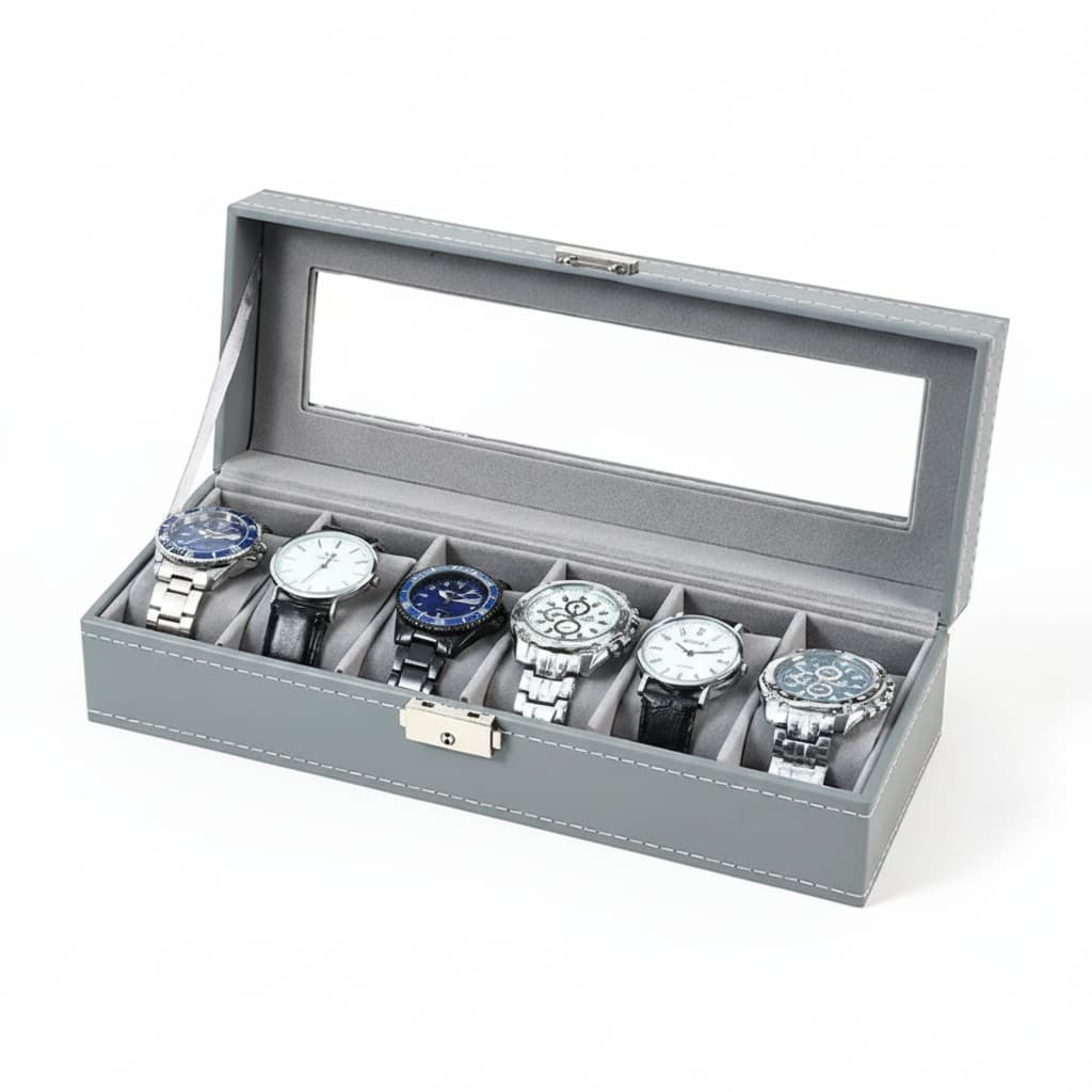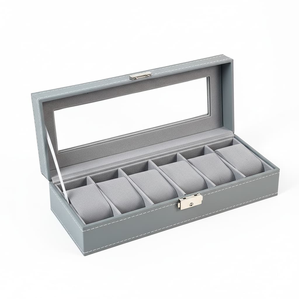 Cette boite à montres en cuir gris est conçue pour offrir un rangement élégant, structuré et sécurisé à votre collection. Son revêtement en cuir synthétique gris apporte une touche sobre et moderne, idéale pour un usage quotidien à la maison comme pour une présentation soignée.