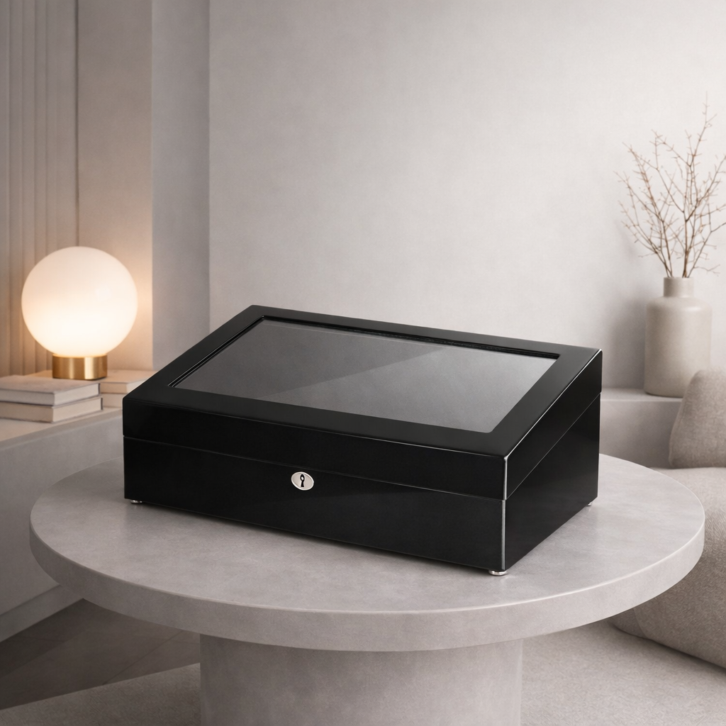 Grâce à son design épuré et intemporel, ce coffret laqué carré est parfaitement adapté à une présentation cadeau, à un packaging premium ou à une utilisation décorative dans une vitrine horlogère.