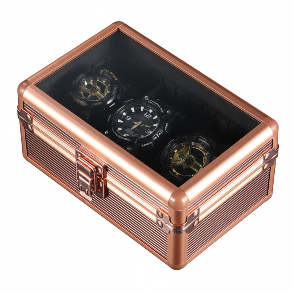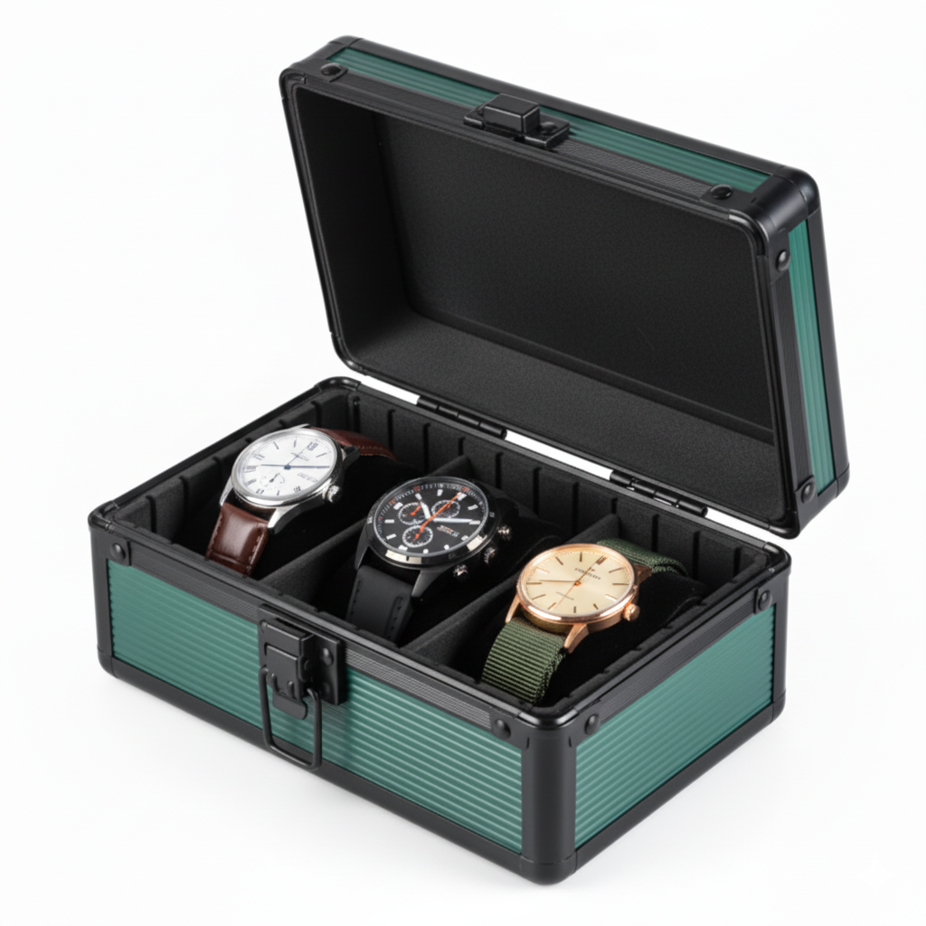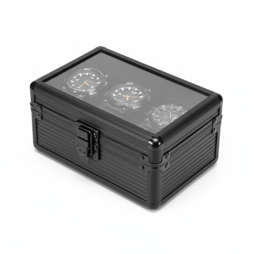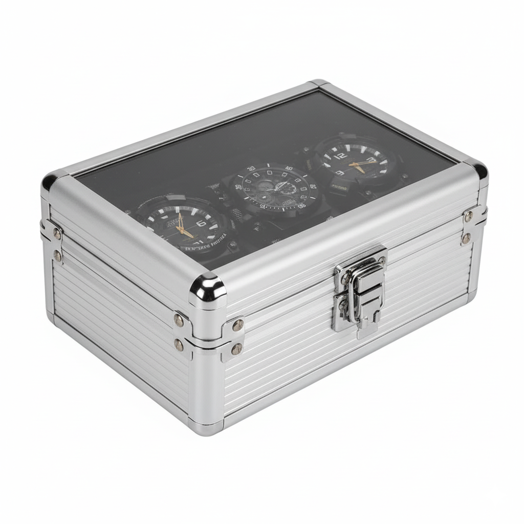 Conçue pour offrir une protection renforcée à plusieurs montres, cette boîte en aluminium pour montres associe solidité, sécurité et compacité. Sa structure rigide protège efficacement les montres contre les chocs, pressions et rayures, tout en restant facile à transporter.