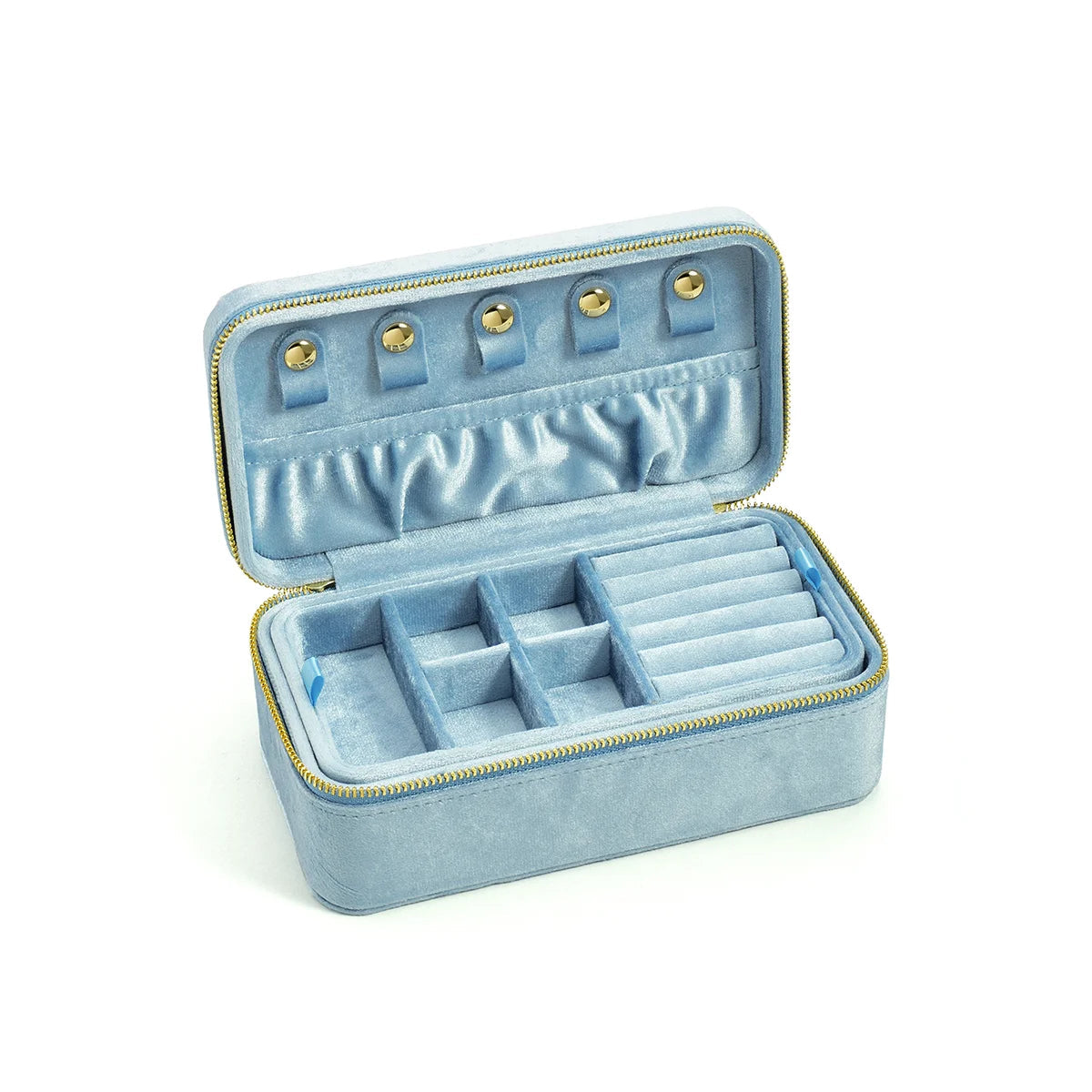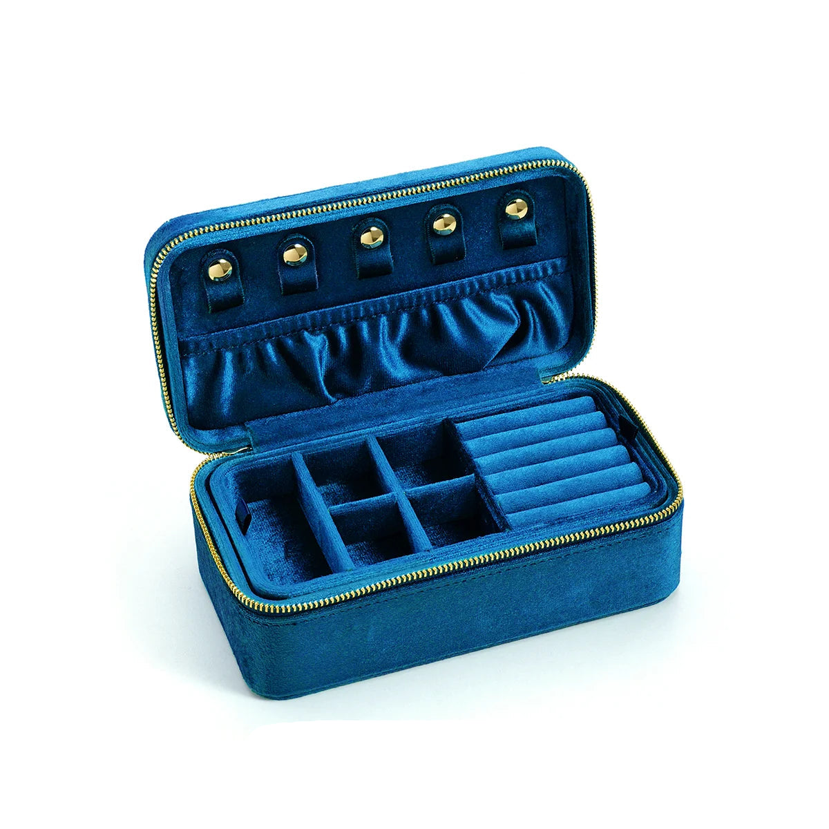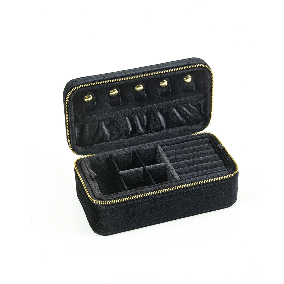 Une boîte à bijoux double étage en velours avec compartiments de rangement.