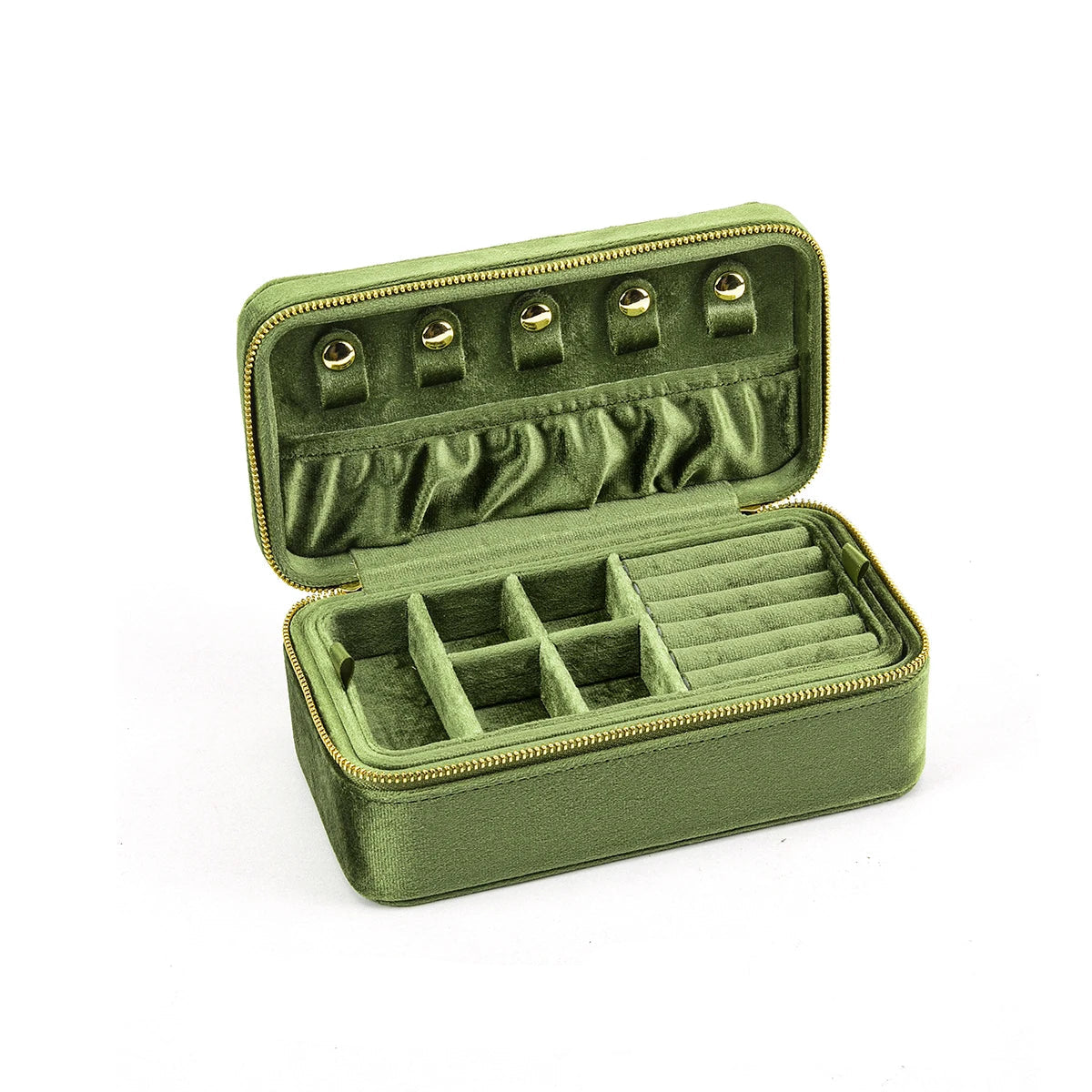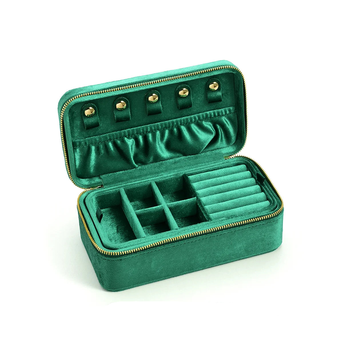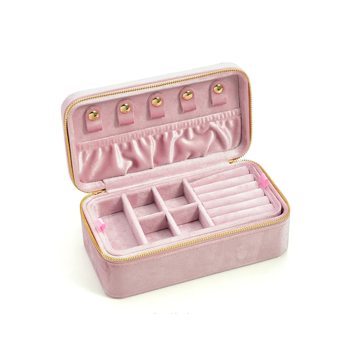 Une boîte à bijoux double étage en velours avec compartiments de rangement.
