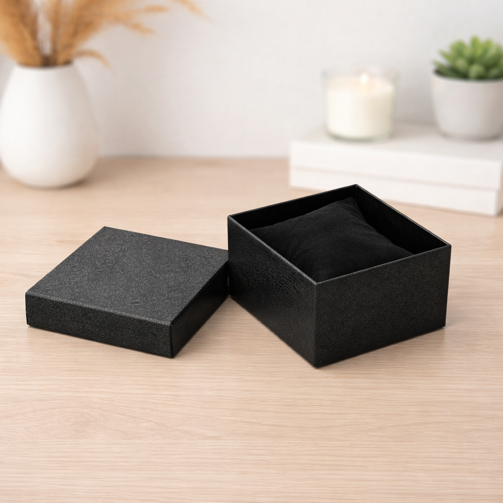 Conçue en carton rigide, elle protège efficacement la montre des frottements et de la poussière tout en conservant un format compact. Sa structure rectangulaire permet d’accueillir une montre ou de petits accessoires de bijouterie en toute simplicité.