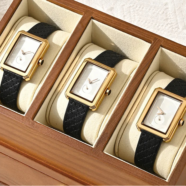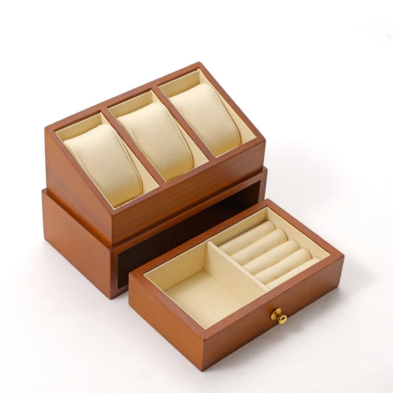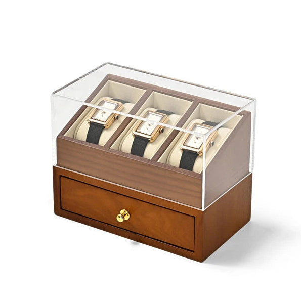 - Capacité : 3 montres + compartiment tiroir pour bijoux
