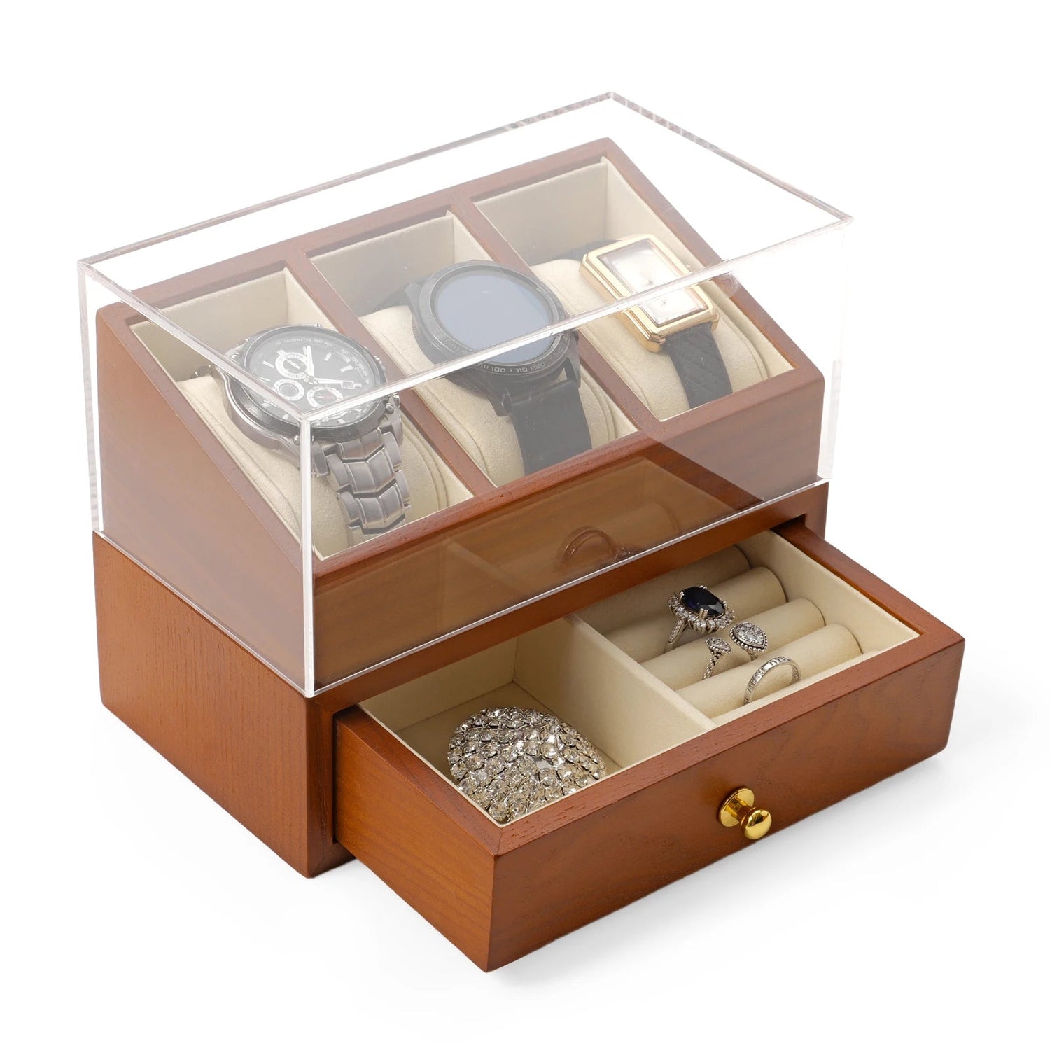 Boîte À Montres En Bois Massif – 3 Montres & Bijoux Avec Tiroir