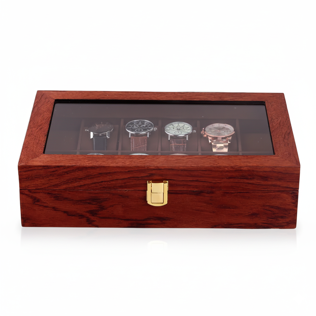 Un Coffret En Bois Pour 12 Montres Avec Couvercle En Verre.