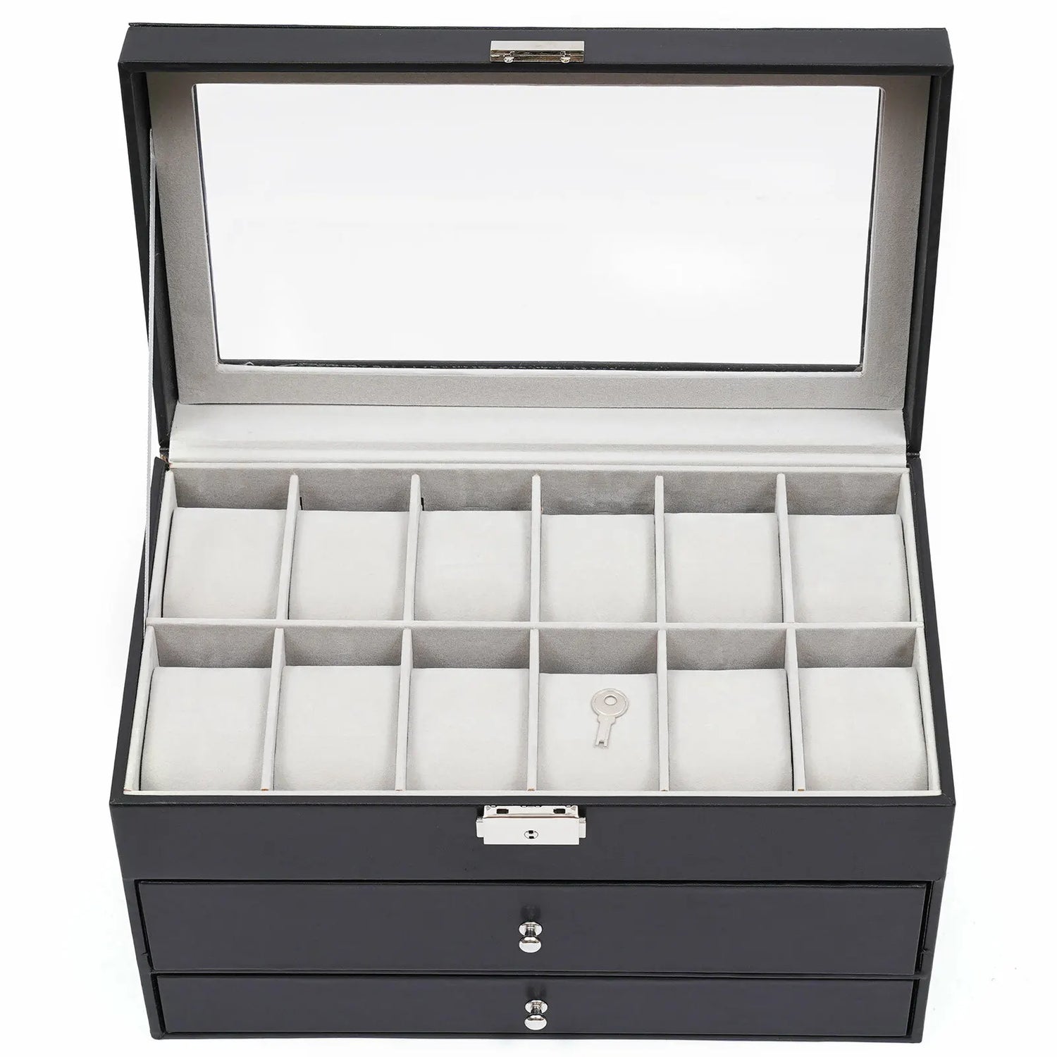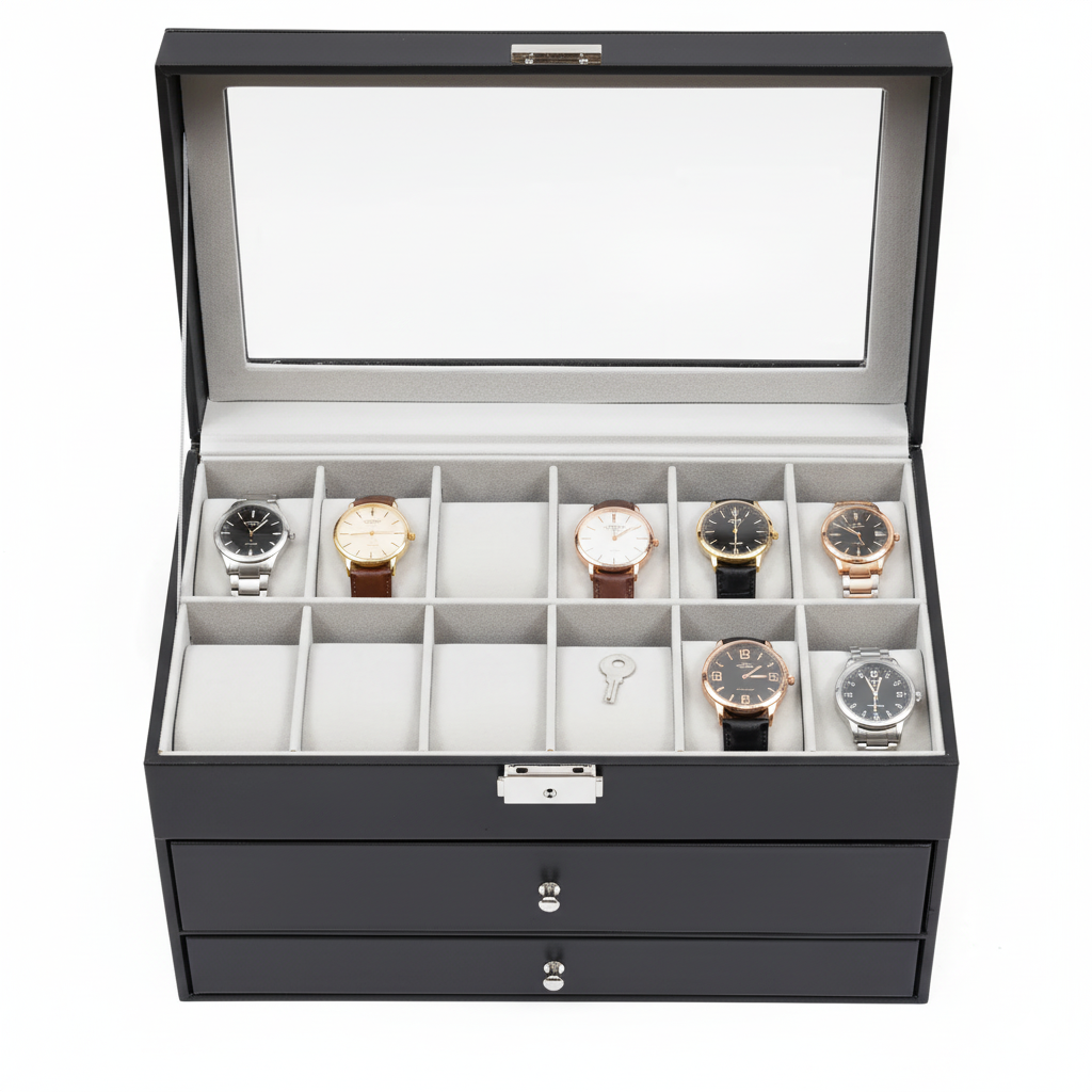 Chaque compartiment est conçu pour maintenir vos accessoires séparément, réduisant ainsi les frottements et les risques de rayures. Le couvercle en verre permet de visualiser le contenu tout en le protégeant de la poussière, tandis que la fermeture métallique avec clé apporte un niveau de sécurité supplémentaire.