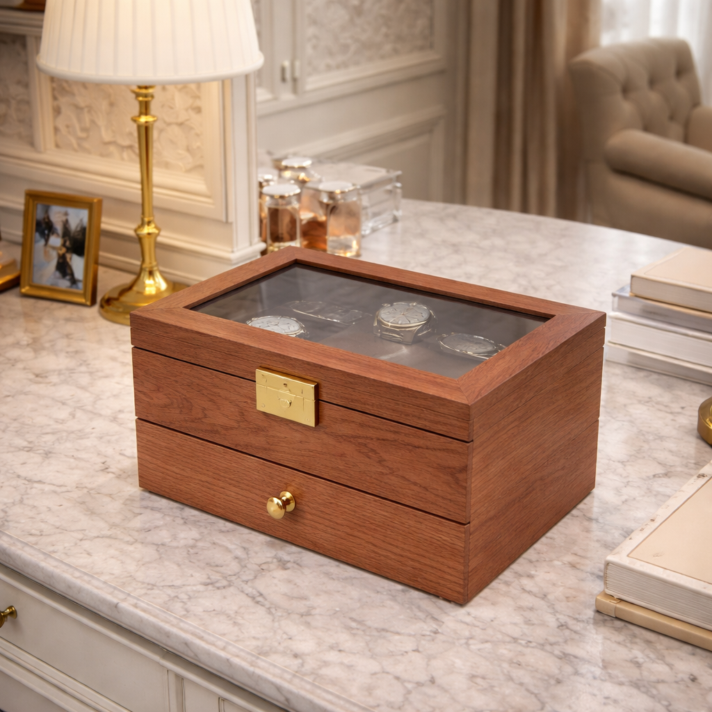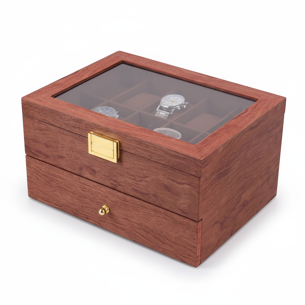 Son couvercle en verre transparent permet d’admirer l’ensemble de la collection en un coup d’œil, tandis que sa poignée métallique robuste facilite l’ouverture et la manipulation. Prêt à l’emploi, ce coffret ne nécessite aucun montage et s’intègre aussi bien dans un dressing que sur un bureau ou une vitrine.