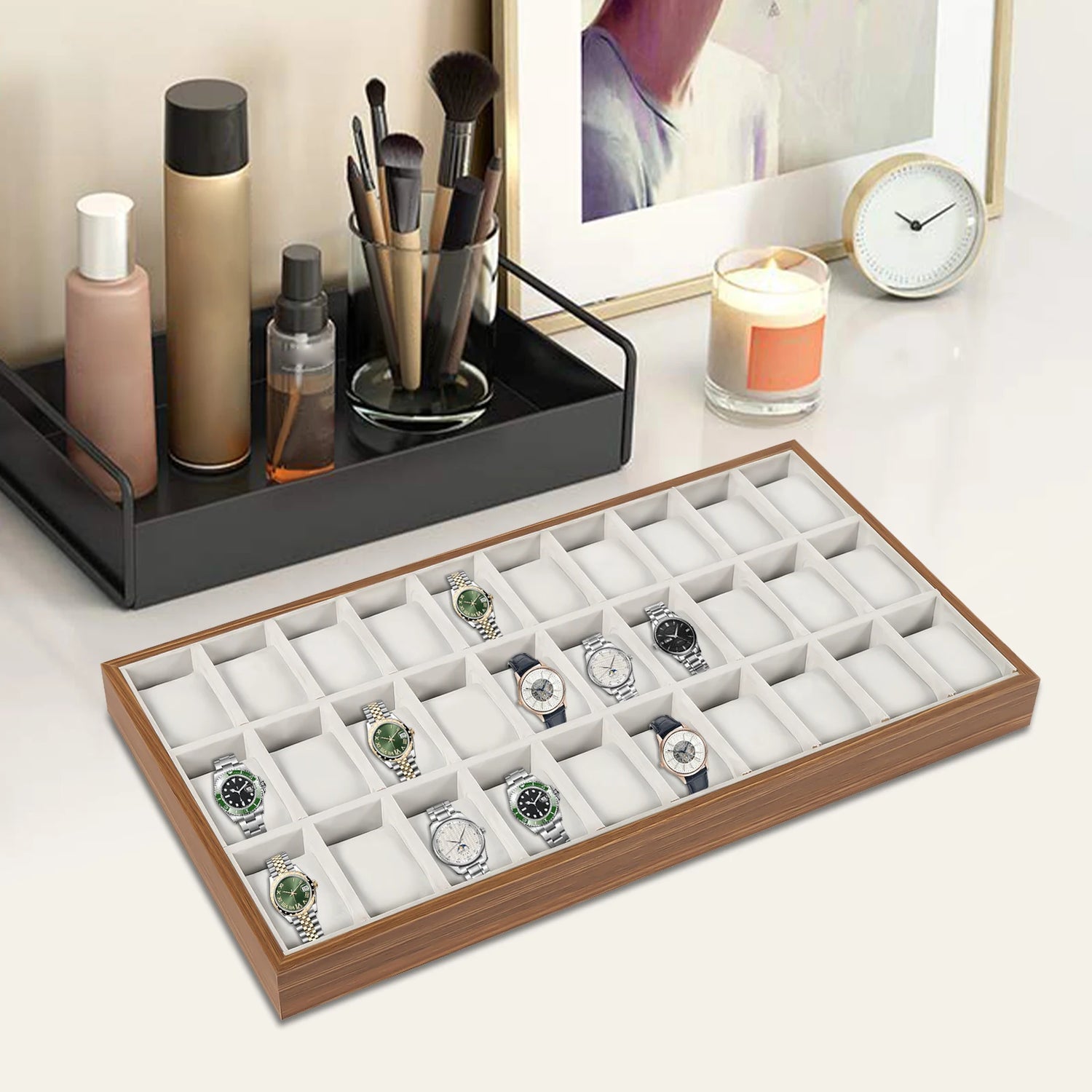 Un Coffret Présentoir En Bois Pour Montres Avec 30 Compartiments Et Coussins En Velours Amovibles.
