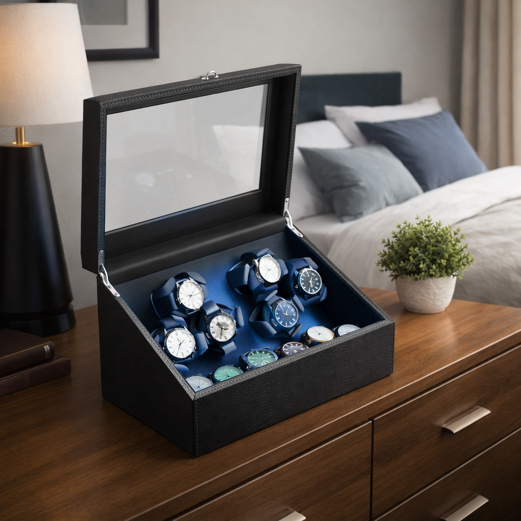 Grâce à ses coussins en mousse à mémoire de forme, chaque montre est maintenue de manière sécurisée, quel que soit le diamètre du boîtier ou la longueur du bracelet. Disponible en plusieurs capacités, ce remontoir avec LED convient aussi bien à un usage domestique qu’à une présentation professionnelle.